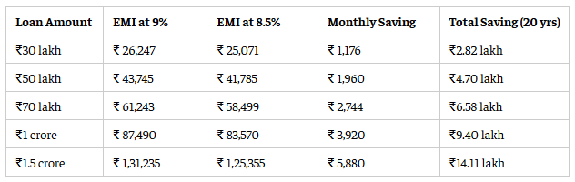 For example, a borrower with a loan amount of Rs 50 lakh will see a monthly EMI saving of Rs 1,960. However, with the 20-year tenure of a home loan, the rate cut will result in total savings of Rs 4.70 lakh.